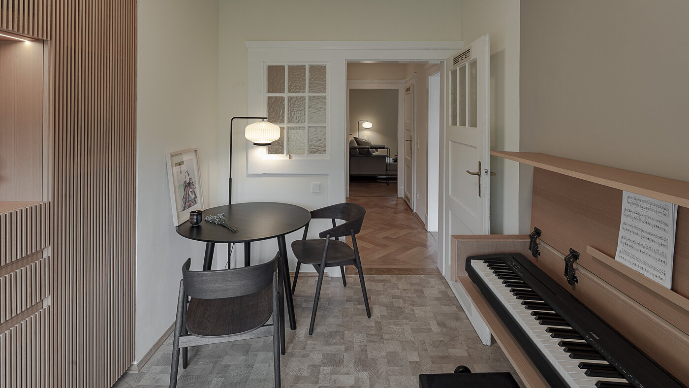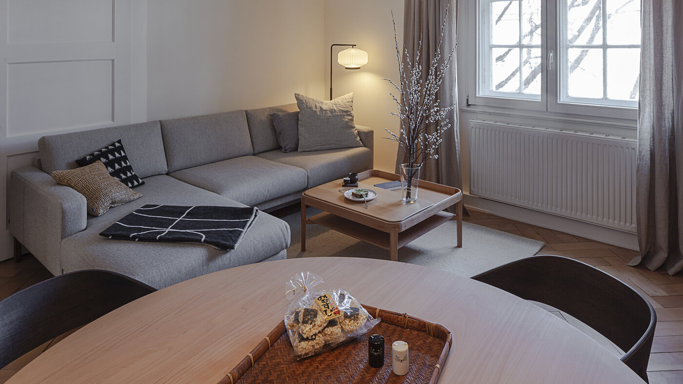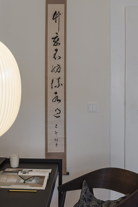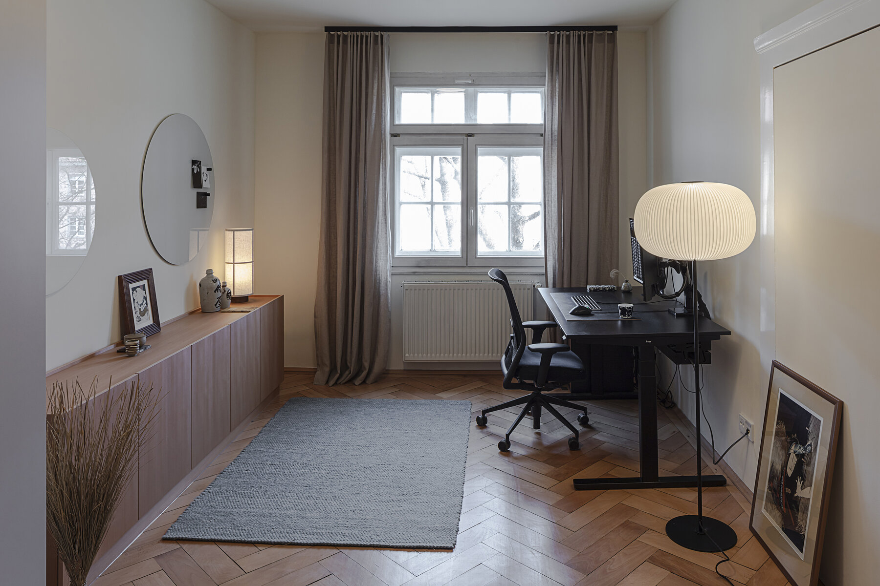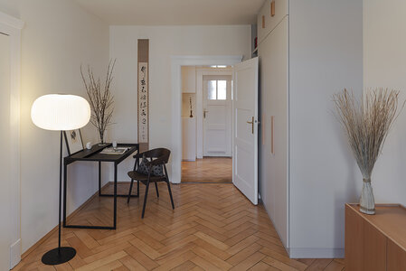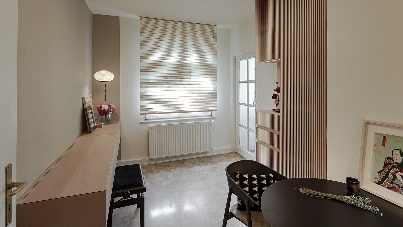 Das Projekt vereint den Charme eines deutschen Altbaus mit minimalistischen Designansätzen, die von der japanischen Ästhetik inspiriert sind. Naturmaterialien und dunkle Akzente schaffen eine harmonische Verbindung zu traditionellen japanischen Elementen. Dabei wurde besonderer Wert darauf gelegt, den Altbau zu sanieren und zu modernisieren, ohne seinen ursprünglichen Charme zu verlieren – so entstand eine stimmige Einheit aus Geschichte und Gegenwart. Die rund 80 Quadratmeter große Wohnung (Baujahr 1925–1927) wurde mit hochwertigen Schreineranfertigungen und neuem Mobiliar ausgestattet. Die Planung erfolgte für ein Ehepaar.