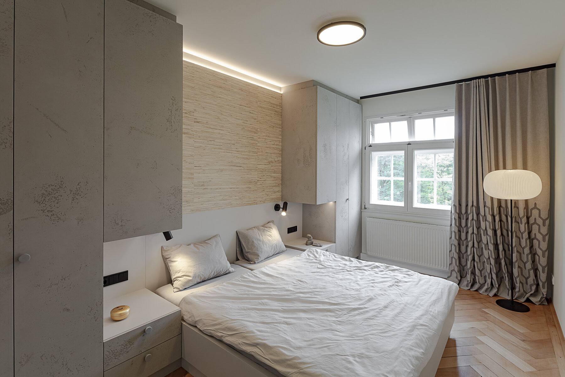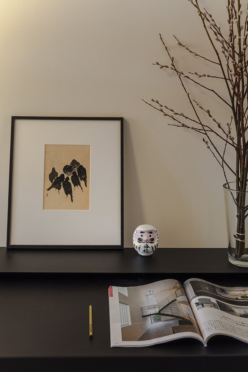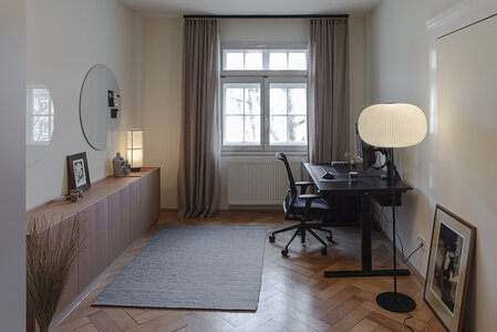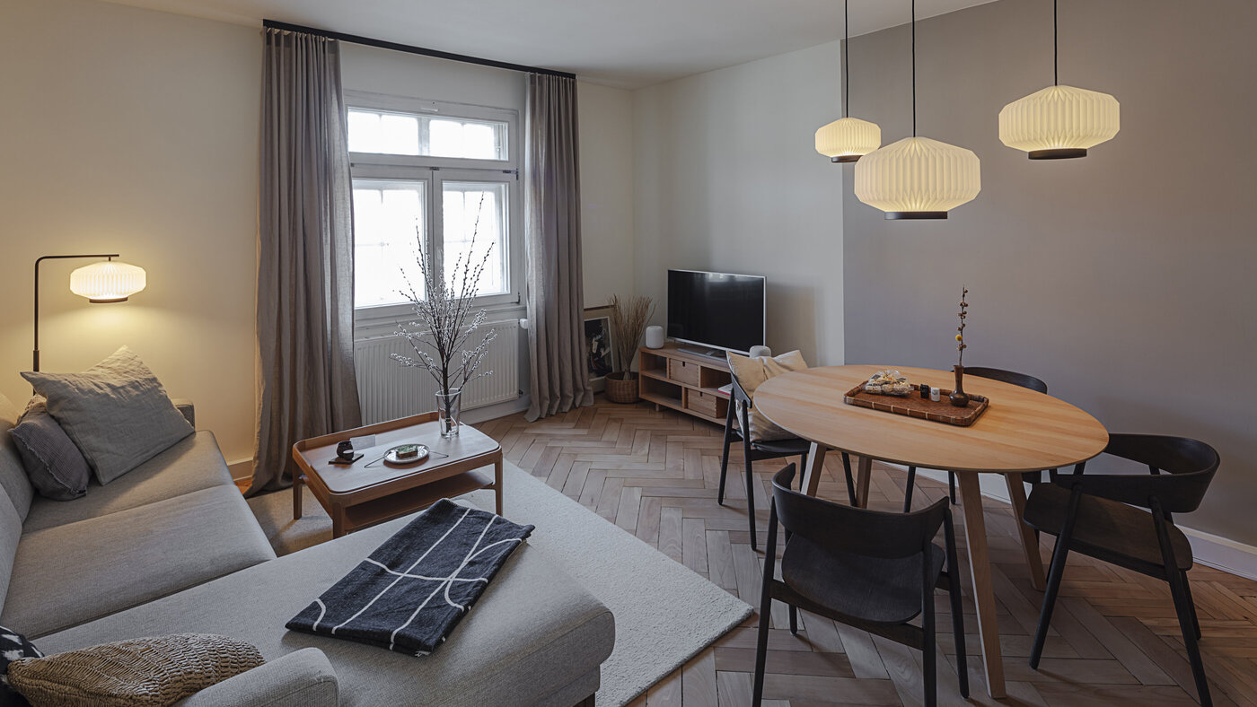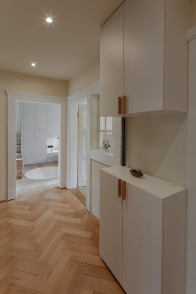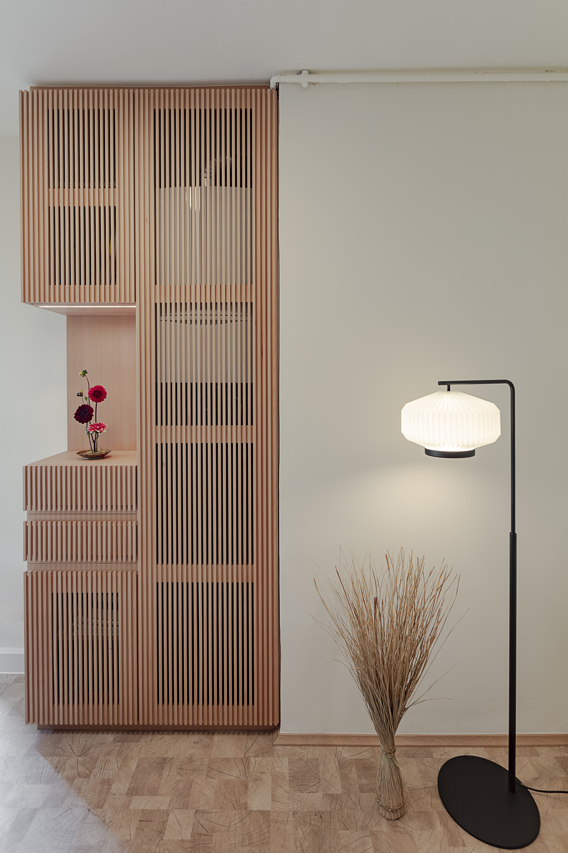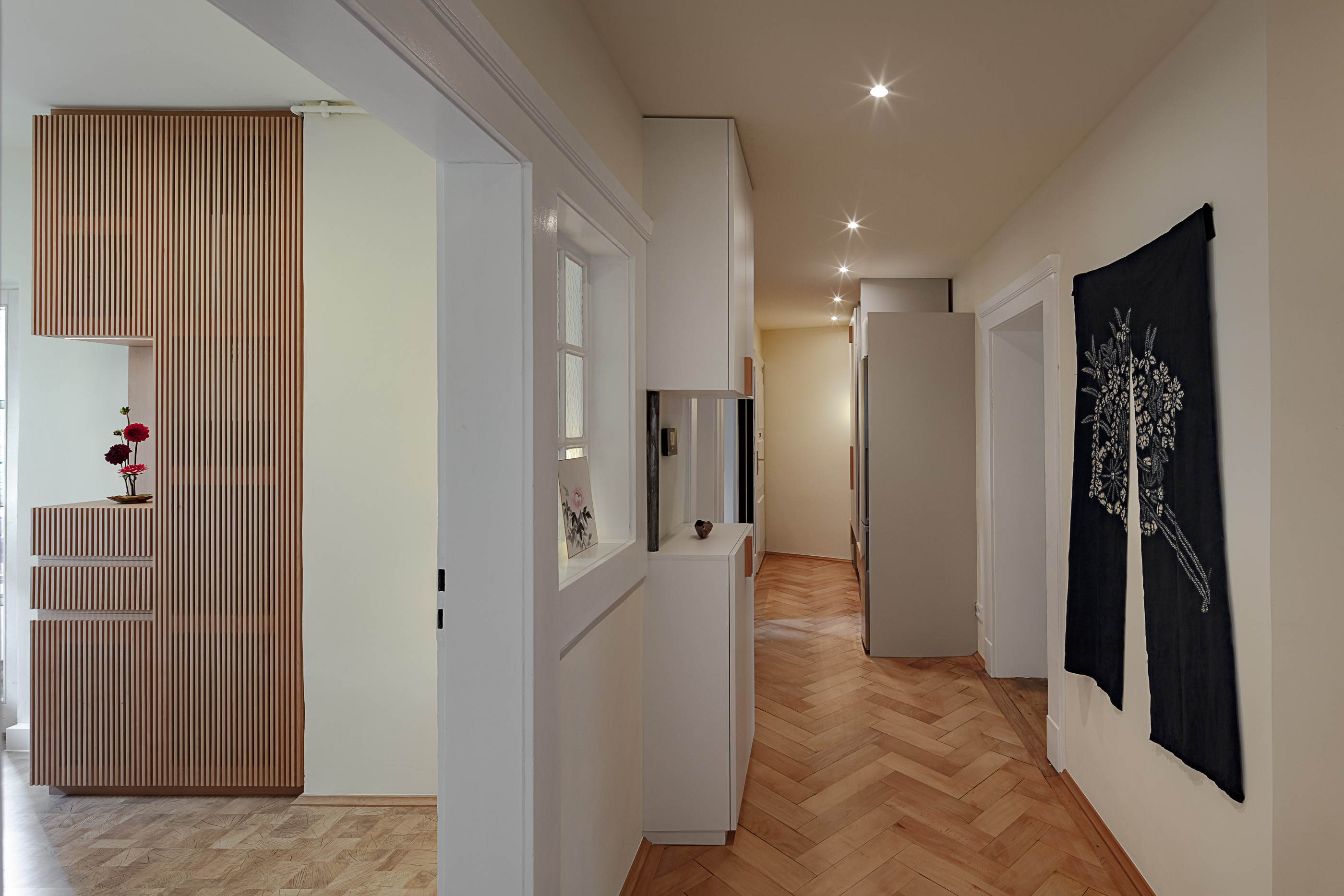 Das Projekt vereint den Charme eines deutschen Altbaus mit minimalistischen Designansätzen, die von der japanischen Ästhetik inspiriert sind. Naturmaterialien und dunkle Akzente schaffen eine harmonische Verbindung zu traditionellen japanischen Elementen. Dabei wurde besonderer Wert darauf gelegt, den Altbau zu sanieren und zu modernisieren, ohne seinen ursprünglichen Charme zu verlieren – so entstand eine stimmige Einheit aus Geschichte und Gegenwart. Die rund 80 Quadratmeter große Wohnung (Baujahr 1925–1927) wurde mit hochwertigen Schreineranfertigungen und neuem Mobiliar ausgestattet. Die Planung erfolgte für ein Ehepaar.